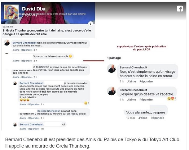 Глава Ассоциации любителей "Токийского дворца" Бернар Шенбо в соцсетях призвал убить 16-летнюю шведскую экоактивистку.