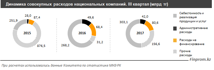 По итогам III квартала текущего года совокупный объем расходов нацкомпаний оценивается в 582,3 млрд тенге, или на 39,5% больше, чем год назад. Примечательно, что наибольшее давление оказало резкое увеличение прочих расходов - сразу на 125,3 миллиарда тенге, или в пять раз. Единственная статья, где расходы уменьшились, - это административные затраты, которые сократились за год на 7,6 млрд тенге, или на 15,4%.
