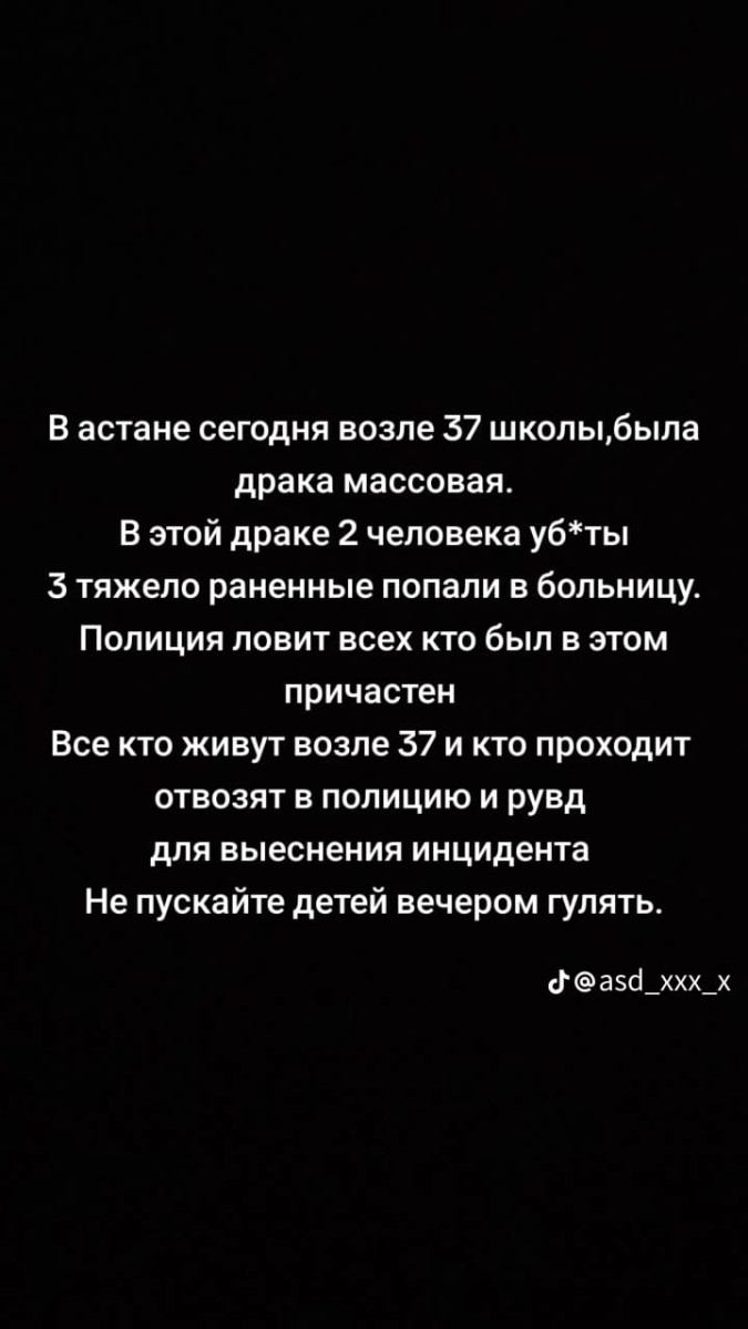 "Информация о самой драке, а также погибших и травмированных в ней не соответствует действительности. Департамент полиции г. Астаны предупреждает, что за распространение заведомо ложной информации предусмотрена уголовная ответственность. Просим доверять только официальным источникам", ― отметили в департаменте.