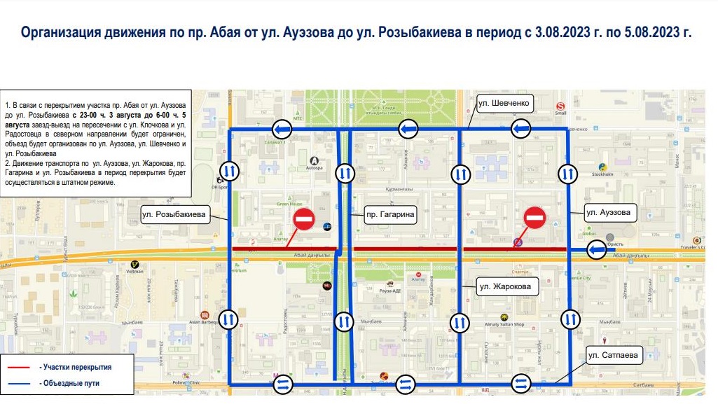 Объезд закрытого участка будет осуществлен через улицы Ауэзова, Шевченко, Сатпаева, Жарокова, Гагарина, Розыбакиева. Сквозное движение транспорта по улицам Ауэзова, Жарокова, Гагарина и Розыбакиева будет доступно. Заезд-выезд с улиц Клочкова и Радостовца в южном направлении на проспект Абая будет ограничен с 23:00 3 августа до 06:00 5 августа.