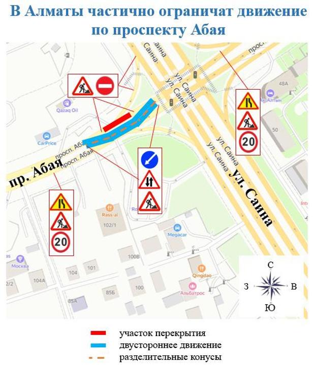 "С 23:00 2 августа до 8:00 5 августа в Ауэзовском районе будет частично ограничено движение автотранспорта по проспекту Абая от улицы Саина в западном направлении до заправки Qazaq Oil. По южной стороне проспекта будет организовано движение в обе стороны. Временные ограничения вводятся для обеспечения безопасности проведения плановых работ на участке реконструкции трубопровода общей протяженностью 1838 метров, введённого в эксплуатацию в 1991 году, проходящего под проезжей частью", - сообщили в ТОО "Алматинские тепловые сети".