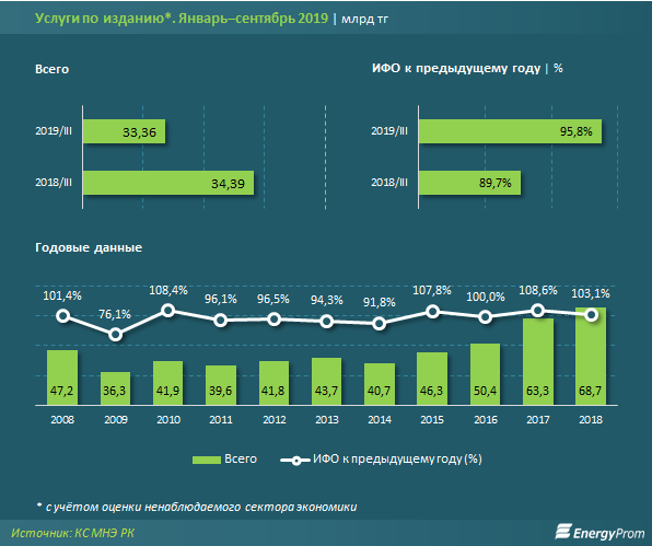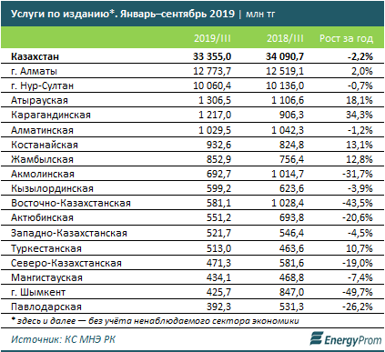 Услуги типографий и издательств за три квартала текущего года составили 3,36 миллиардов тенге, против 34,39 миллиардов тенге в аналогичном периоде годом ранее, передает