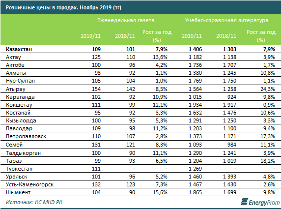 Учебно-справочная литература подорожала за год так же на 7,9%, до 1406 тг в среднем по городам страны. Самые высокие цены среди крупных городов и мегаполисов РК зафиксированы в Кокшетау, Шымкенте и Нур-Султане.