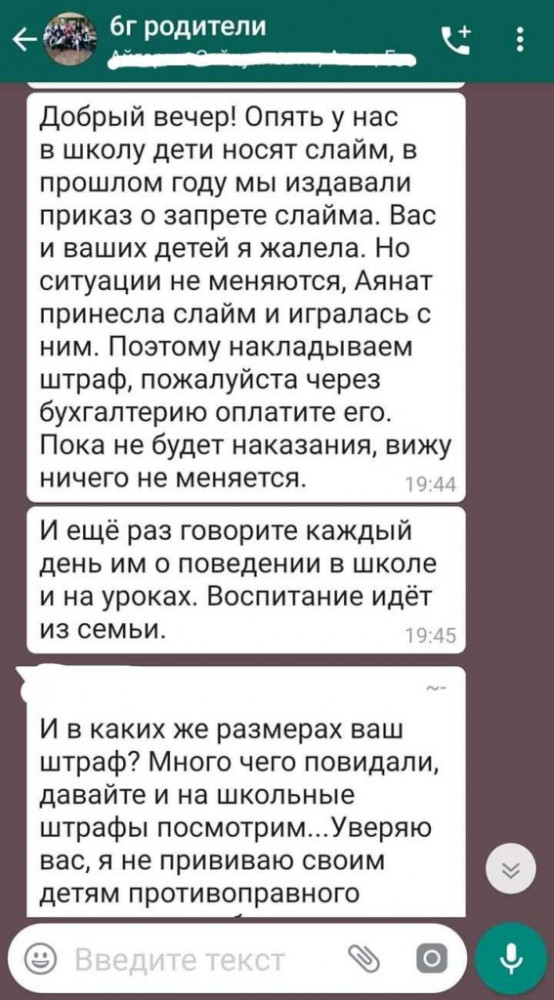 Родители девочки якобы должны оплатить штраф 5 000 тенге в школьной бухгалтерии за то, что их дочь играла со слаймом на перемене. Позже в соцсетях была опубликована переписка из родительского чата.