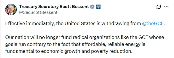 По его словам, решение вступает в силу немедленно. Вашингтон прекращает любое дальнейшее финансирование фонда, который, как отметил Бессент, продвигает цели, противоречащие экономическим интересам Соединённых Штатов.