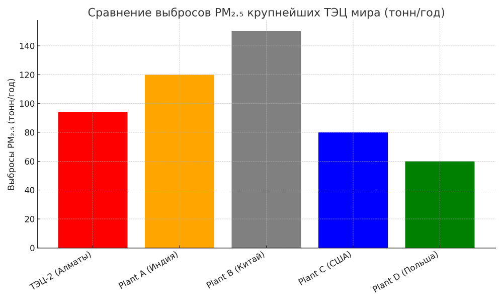 Специалисты фонда Almaty Air Initiative пришли к выводу, что ТЭЦ‑2 входит в число крупнейших источников выбросов PM₂.₅ среди объектов мира. В 2024 году фиксировались десятки тонн этих частиц от ТЭЦ: только за год - порядка 94 тонн этих микрочастиц.