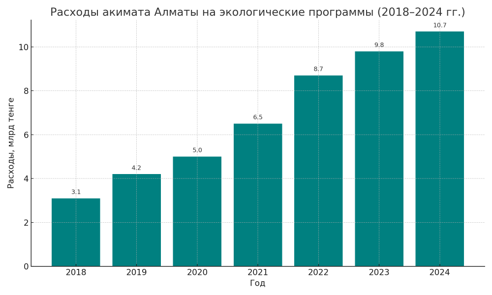 Расходы на экологические программы выросли с 3,1 млрд тенге в 2018 году до 10,7 млрд тенге в 2024 году.