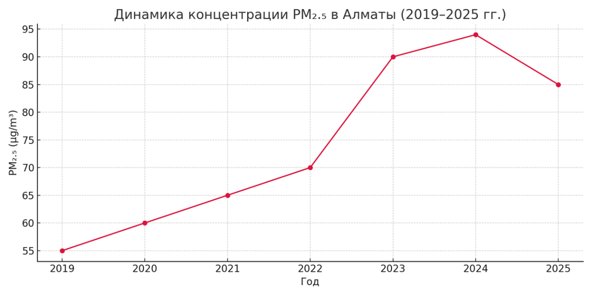 На графике видно, что показатели PM₂.₅ растут в зимний сезон, достигая пика в 2024–2025 годах.