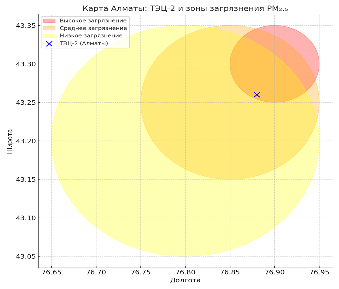 Дело в том, что ТЭЦ‑2 и ТЭЦ‑3 используют высокозольный уголь, что усиливает проблему: в процессе сжигания образуется большое количество мелкодисперсной пыли и токсичных соединений. В масштабе города, по версии по версии IQAir, Алматы занимает второе место среди городов мира по уровню загрязнения воздуха (на определённые даты) - с высоким AQI и превышениями предельных норм.