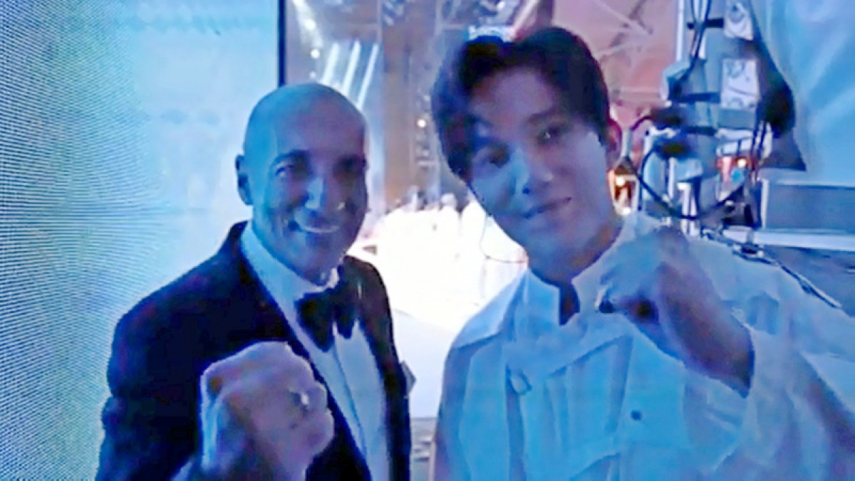 Димаш Кудайберген. Крутой и Димаш обнимают друг друга перед выходом на сцену.