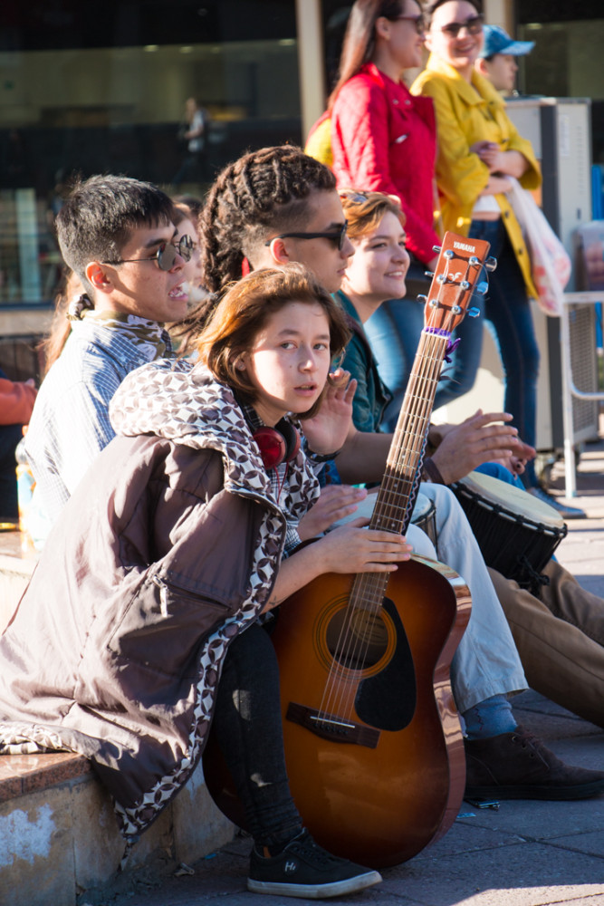 Немного поодаль расположилась целая компания молодых людей. В их руках гитары, барабаны, а в глазах - огонь. Для них улица - способ самовыражения и источник хорошего настроения, признаются ребята.