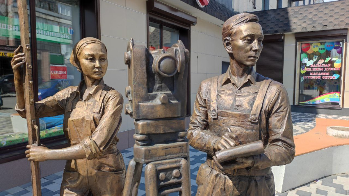 Рядом с домом специалистов замерли его постояльцы – геодезисты. Почти живые, они проводят топографическую съёмку. В руках линейка и блокнот. Рядом, на треноге – оптический прибор теодолит. Парень и девушка измеряют вертикальные и горизонтальные углы перекрёстка.