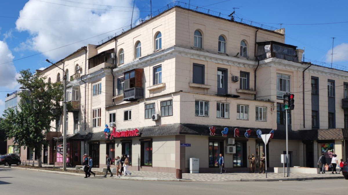 И последний, самый младший дом перекрёстка – это многоэтажка из силикатного кирпича родом из конца 80-х. Образец типовой застройки, массовый новодел своего времени. Он примечателен тем, что здесь жили известные деятели Семея, врачи и учителя. В том числе один из отцов-основателей общества "Прииртышье", краевед, тележурналист Фёдор Занарин.