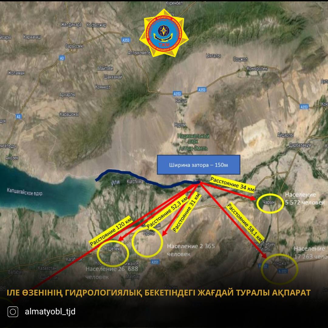 "На место направлена оперативная группа для проведения визуального осмотра и оценки возможного разлива из устья реки Или. По результатам обследования в случае определения угрозы населённым пунктам будут приняты меры. Ближайший населённый пункт - село Шарын находится на расстоянии 15-20 километров", - уточнили в ДЧС.