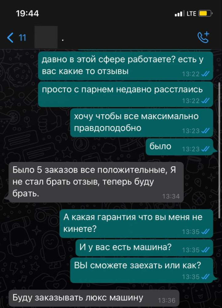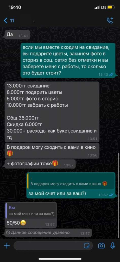 Чтобы сходить на свидание с этим парнем, заказчице придется заплатить 15 тысяч тенге, при условии что счет будет оплачивать сама девушке. А если хотите получить в подарок цветы - еще восемь тысяч, только букет придется купить самой. За совместное фото в социальные сети придется отдать - пять тысяч тенге. При желании дамы могут выбрать даже внешний вид своего кавалера на вечер, за одежду придется заплатить 10 тысяч. А если девушку не устраивает лук парня, она может доплатить пять тысяч и провести время со своим "идеальным парнем". Если заказать одновременно несколько услуг, предприниматель пойдет на встречу, сделает скидку и даже подарок. Рассказать о своем "бизнесе" предприимчивый мужчина не захотел. Но не отказался от переписки в мессенджере.