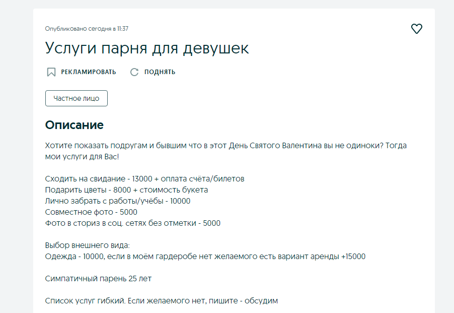 Одиноким казахстанкам в День святого Валентина предлагают за их деньги сходить на свидание, "подарить" цветы и сделать совместные фотографии для соцсетей. Смекалистый парень из столицы решил подзаработать в день влюбленных и выложил на популярном сайте объявление "услуги парня на 14 февраля", передает корреспондент BaigeNews.kz.