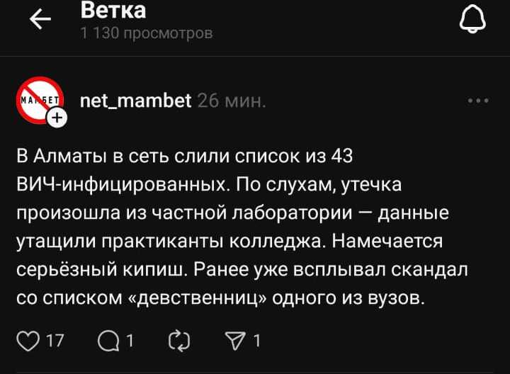 Как сообщается в популярной соцсети Threads, студенты одного из медицинских колледжей города получили список людей, живущих с ВИЧ, во время практики в лаборатории и затем распространили его в сети. Пока название учебного заведения и клиники не раскрыты.
