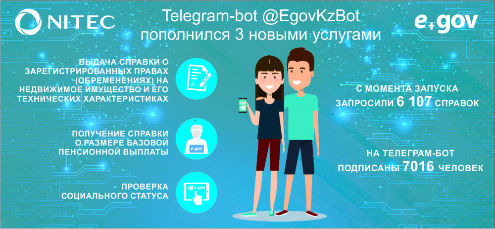 Напомним, что 21 мая 2018 года Асетом Турысовым, Председателем Правления АО "НИТ" был анонсирован запуск Telegram-бота, в котором в упрощённом виде стало возможным получение 4 популярных услуг: адресной справки, справки об участии физического лица в других юридических лицах, справки о несудимости и справки о наличии либо отсутствии недвижимости.
