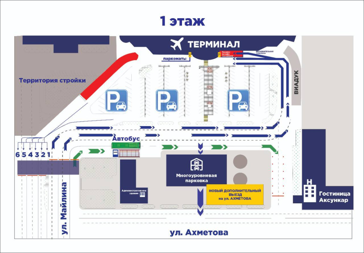 Администрация аэропорта напоминает, что для выезда с территории аэропорта пассажиры могут воспользоваться всеми шестью пунктами выезда на улицу Майлина. Также открыт дополнительный выезд с территории аэропорта через многоуровневый паркинг на улицу Ахметова.