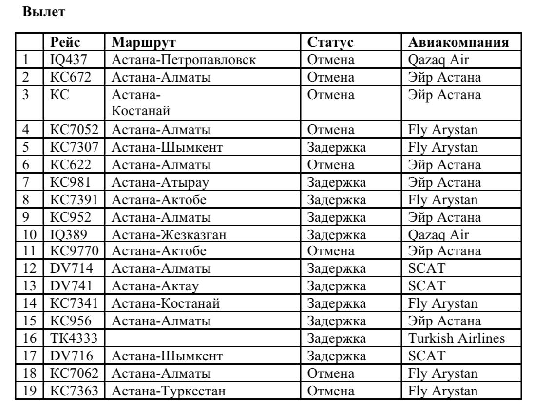 В аэропорту Астаны отменили и задержали 45 авиарейсов