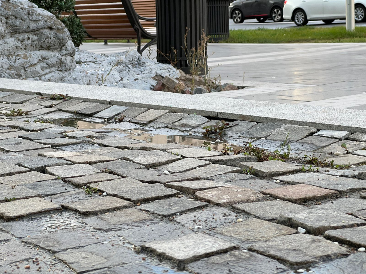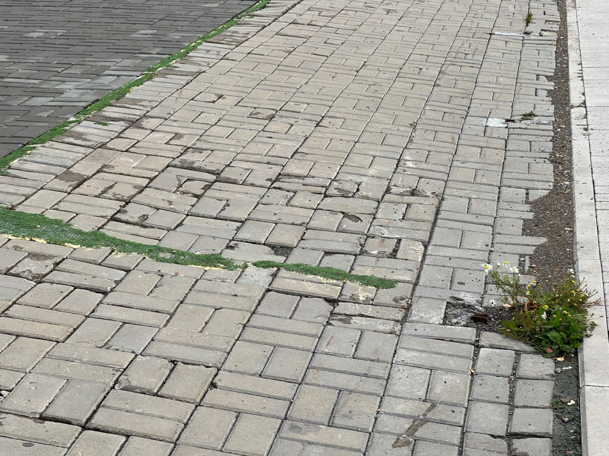 На фото: Так выглядит плитка на центральной улице Мнгилик Ел. Ходить по ней просто невозможно и даже опасно, есть риск споткнуться ососбенно в сумерках. Также под такой плиткой после дождя скапливается вода и наступя можно легко замараться.