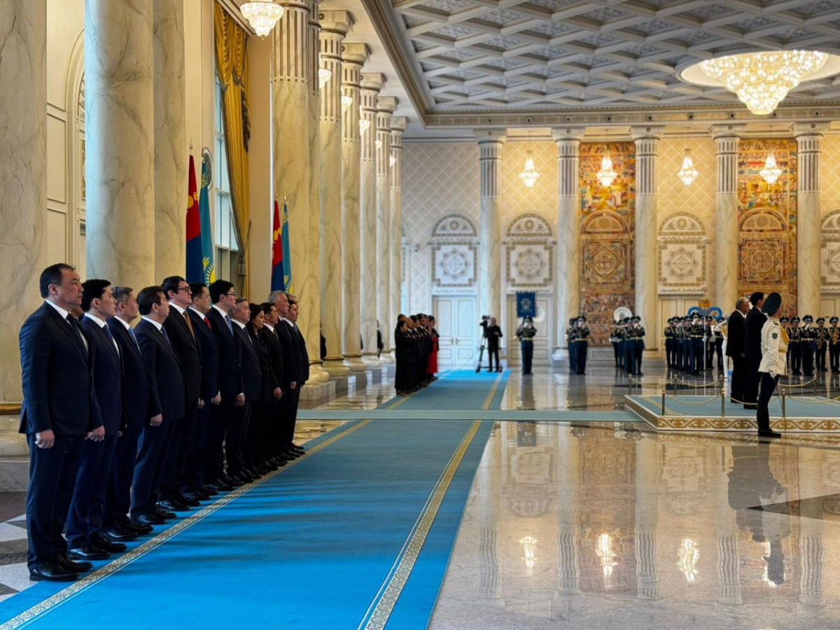 После этого Президент Монголии отдал дань уважения Государственному флагу Казахстана. Затем главы государств направились в зал переговоров.