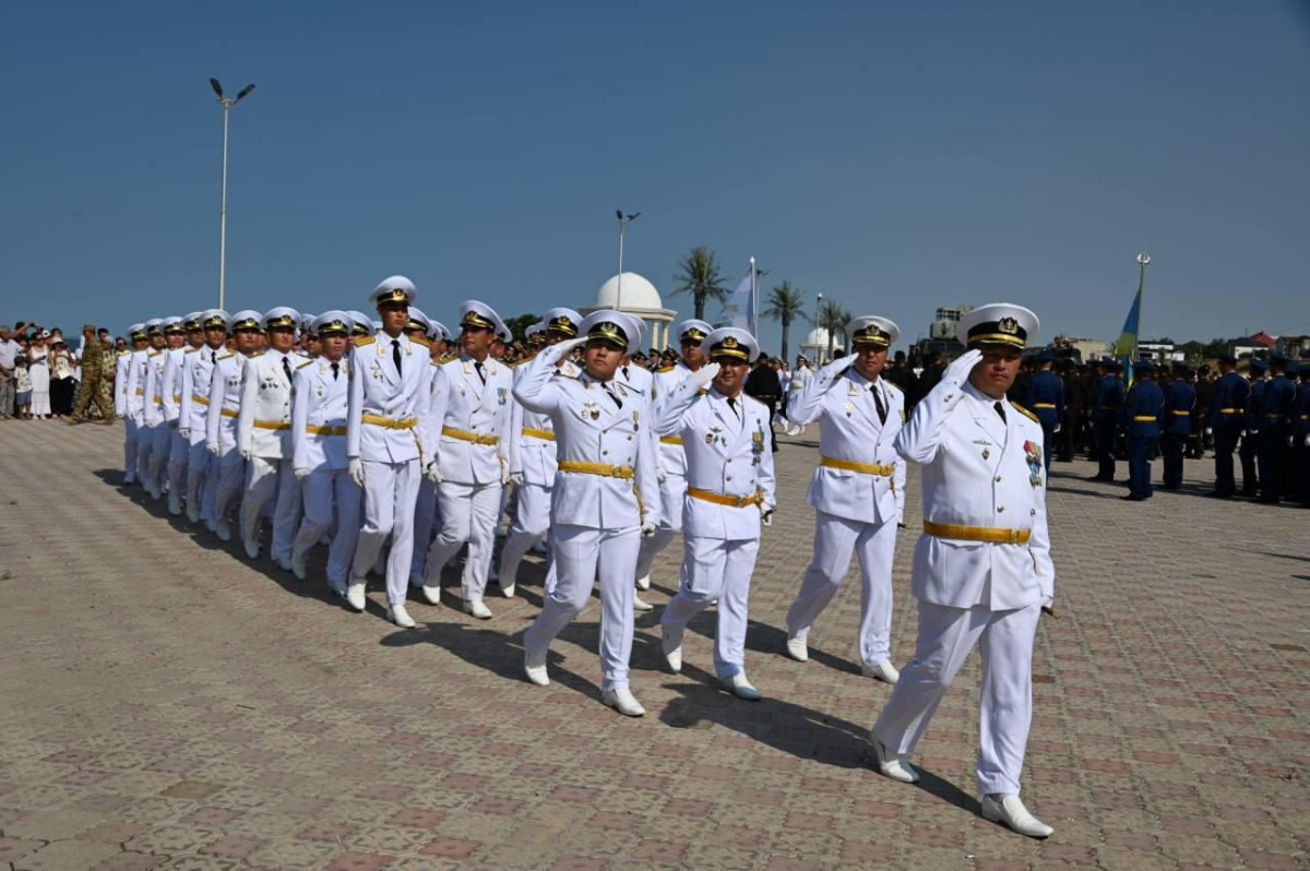 Церемония началась с исполнения Государственного гимна и поднятия Государственного и Военно-морского флагов. С поздравительной речью выступил командир военно-морской базы, капитан первого ранга Есенгали Байботаев, подчеркнувший значение Военно-морских сил для защиты национальных интересов в казахстанском секторе Каспия.