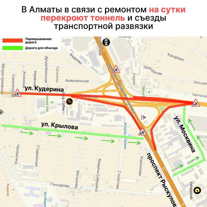 "С 23:00 28 июля до 23:00 29 июля движение будет полностью перекрыто по улице Кудерина в северном направлении от улице Сахалинской до конца тоннеля, съезд с пр. Рыскулова в западном направлении, съезд на ул. Северное кольцо в восточном направлении, разворот с южного направления. Объезд будет обеспечен по улицам Москвина, Сахалинской, Крылова и Бокейханова", — говорится в сообщении пресс-службы акимата города.