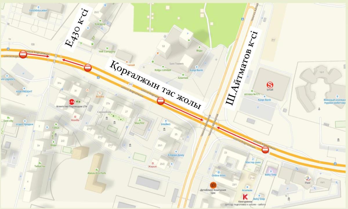 С 29 июля по 20 августа на участке дороги будет проводиться демонтаж разделительного островка с целью устройства дополнительной полосы движения. Работы затронут два ключевых перекрёстка: Кургальжинское шоссе/Айтматова и Кургальжинское шоссе/Айтматова/Е-430. В связи с этим движение на подходах к этим перекрёсткам с обеих сторон будет частично ограничено.