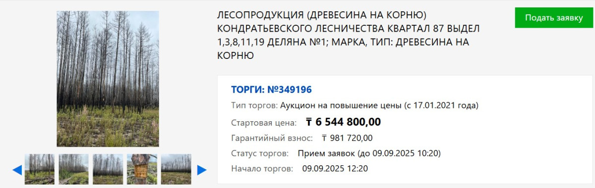 В Аулиекольском районе Костанайской области выставили на продажу древесину "на корню" с участков, пострадавших в крупном лесном пожаре три года назад, передает BAQ.KZ.