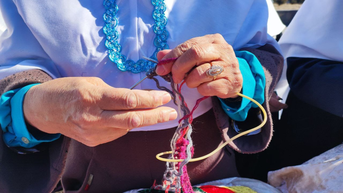 Справа от юрты Кенена Азербаева удобно устроились пожилые весёлые женщины в национальных костюмах. Каждая из них, сидя за столом с хэнд-мэйд изделиями, умело орудует спицами, пряжей, иголкой. Они демонстративно шьют, очищают овечью шерсть и прядут пряжу, пришивают к лоскутам национальные орнаменты из яркой ткани. И всё это под звуки гармони собственного исполнения.