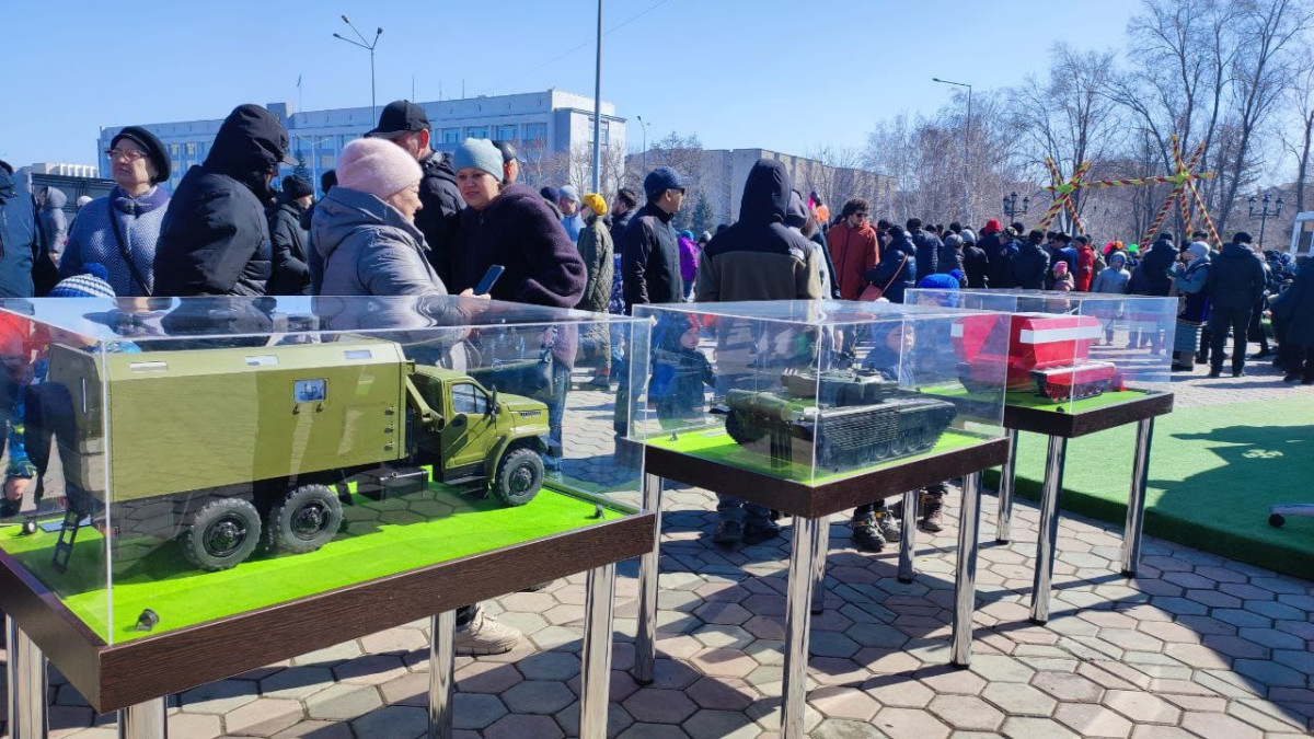 Пожалуй, одной из самых зрелищных и брутальных площадок стала выставочная зона у юрты предприятия "Семей-Инжиниринг". Сотрудники создали боевую атмосферу. Здесь все спешили побывать внутри огромного конверсионного автомобиля на 12 мест. Как выяснилось, это вполне гражданская техника, предназначенная для охоты и рыбалки.