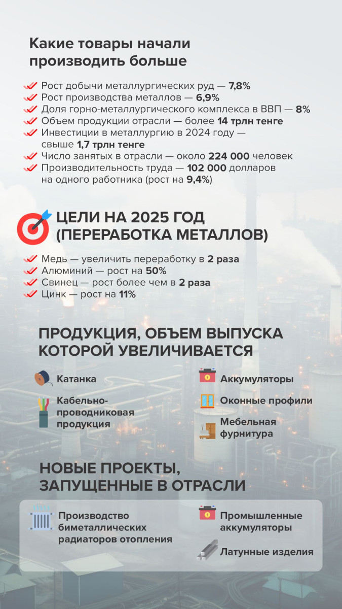 "Переработка меди достигнет до 91 тыс. тонн, алюминия до 163 тыс. тонн и свинца до 81 тыс. тонн. Добыча медной руды вырастет вдвое — до 300 млн тонн, а производство стали — с 4,1 до 13 млн тонн", - отметил Сапарбеков.