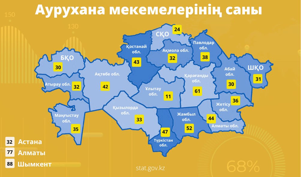 "Самое большое количество больниц в Шымкенте – 88, наименьшее в области Улытау – 11", - сообщили в ведомстве.