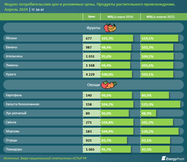 Среди фруктов яблоки выросли в цене на 19,1% за год, до 677 тг за кг, апельсины — на 4,1%, до 1 тыс. тг за кг, бананы — на 3,7%, до 987 тг за кг, лимоны — на 3,6%, до 1,2 тыс. тг, курага — на 3,1%, до 4,2 тыс. тг.