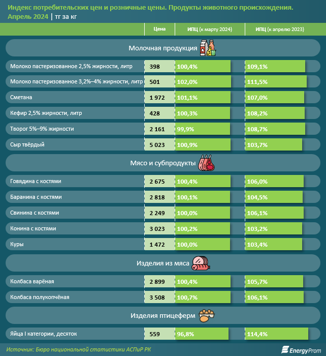 Пастеризованное молоко 2,5% жирности продавалось по 398 тг за литр, молоко 3,2%–4% жирности — по 501 тг, кефир 2,5% жирности — по 428 тг. Килограмм сметаны стоил 2 тыс. тг, творога — 2,2 тыс. тг, твёрдого сыра — 5 тыс. тг.