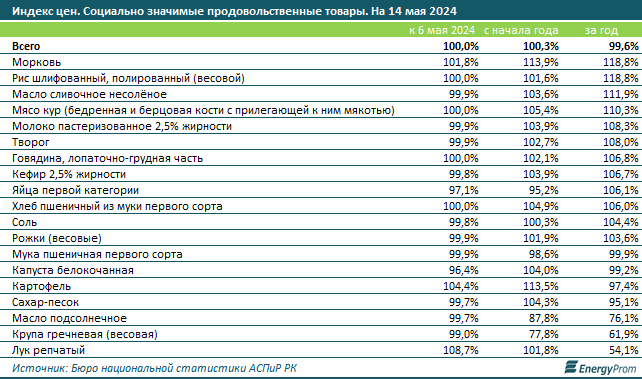 Цены на социально значимые продовольственные товары (СЗПТ) в РК на 14 мая текущего года с начала года выросли на 0,3%, хотя в сравнении с аналогичным периодом 2023-го снизились на 0,4%, передаёт BaigeNews со ссылкой на Energyprom.