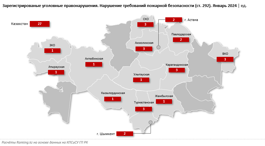За первый месяц года подобные правонарушения были зарегистрированы в 14 из 20 регионов РК (годом ранее — в 16). Чаще всего уголовные правонарушения, относящиеся к нарушению требований пожарной безопасности, регистрировали в Акмолинской, Восточно-Казахстанской, Северо-Казахстанской, Карагандинской и Туркестанской областях.