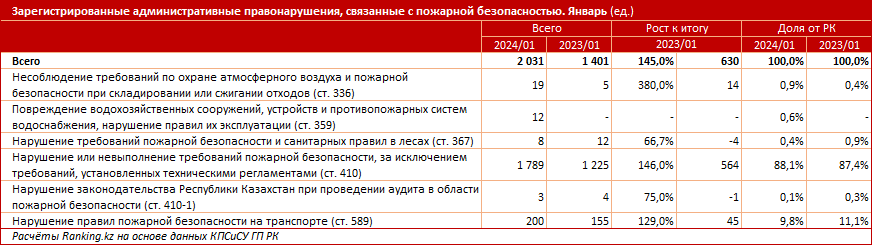 В январе текущего года в стране зарегистрировали 2 тысячи административных правонарушений, связанных с пожарной безопасностью - сразу на 45% больше, чем в январе 2023-го, передаёт BaigeNews.kz со ссылкой на ranking.kz.