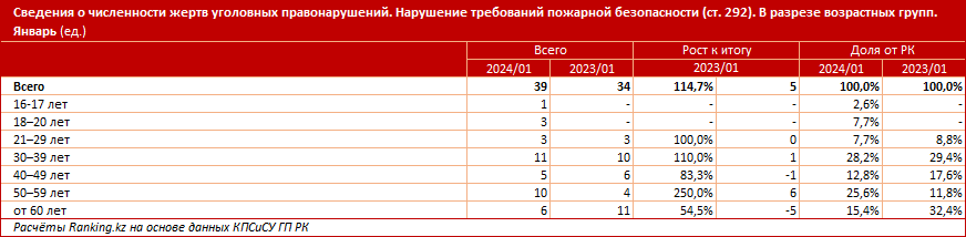 Жертвами уголовных правонарушений, относящихся к нарушению требований пожарной безопасности, в январе стали 39 человек — на 14,7% больше, чем годом ранее. Среди них был 1 студент, 1 человек с особыми потребностями и 3 пенсионера.
