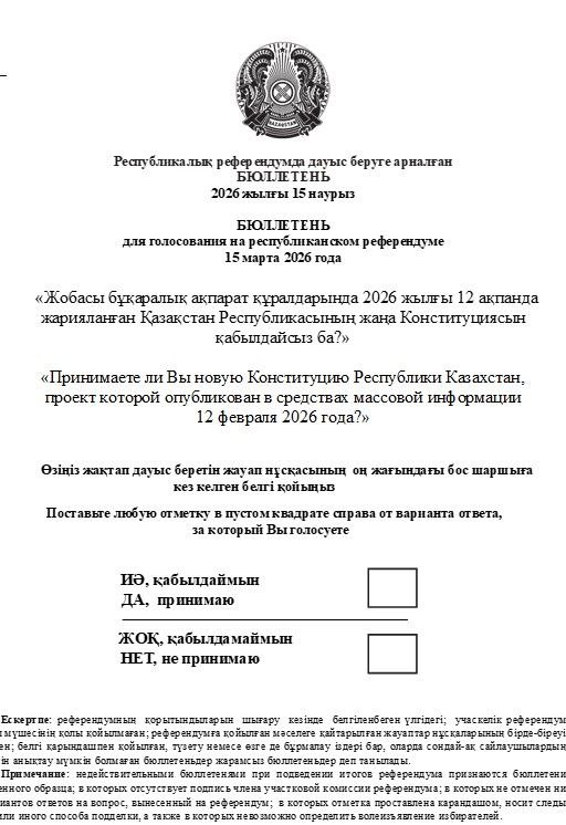 Бюллетень написан на двух языках и в нем задается только один вопрос: Принимаете ли Вы новую Конституци. Республики Казахстан, проект которой опубликован в средствах массовой информации 12 февраля 2026 года?