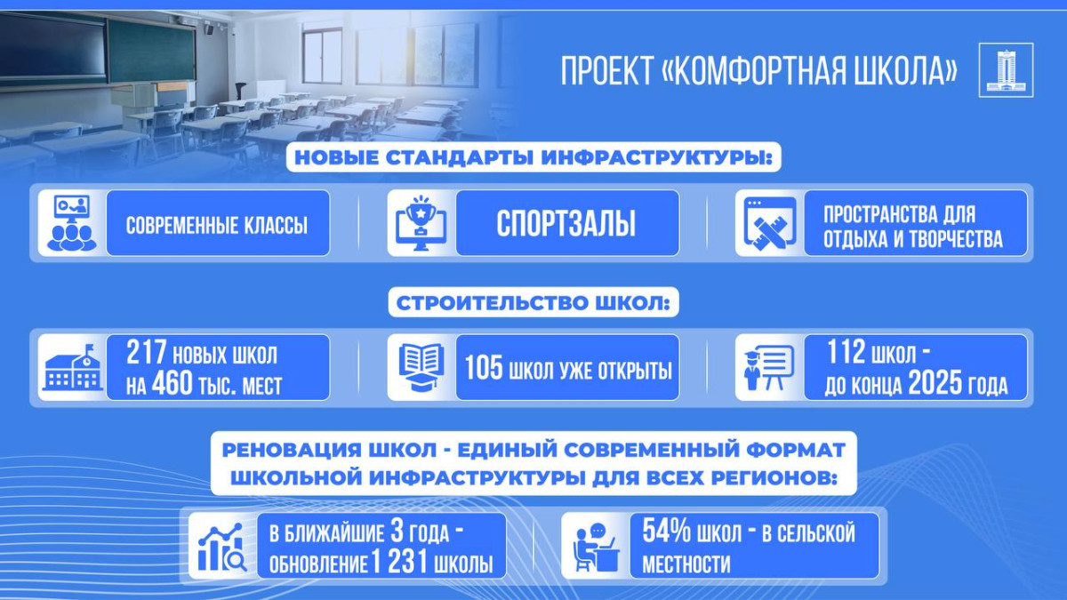 Следующий этап — реновация существующих школ. В ближайшие три года по всей стране планируется капитально обновить 1 231 здание, из которых 54% расположены в сельской местности. Программа реновации охватывает ремонт крыш, фасадов, замену окон и инженерных сетей, а также благоустройство пришкольных территорий.