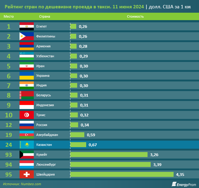 На 11 июня текущего года, по данным Numbeo, Казахстан оказался на 24-м месте из 95 в мире по дешевизне проезда в такси в расчёте на 1 км пути. В РК стоимость составила 0,67 долл. США.