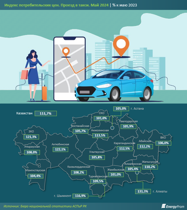 Сильнее всего рост цен в секторе почувствовали жители Алматы (на 31,3%), а также Актюбинской (на 22,1%) и Западно-Казахстанской (на 21,3%) областей. В пятёрку регионов с наибольшим удорожанием услуг такси также попали Шымкент (на 16,9%) и Акмолинская область (на 13,5%).