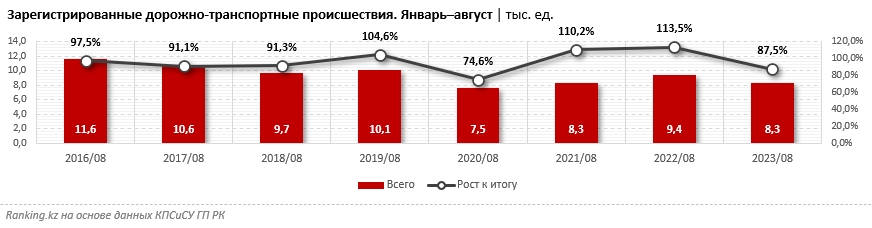Согласно статистике, за январь–август 2023 года в Казахстане зарегистрировали 8,3 тысячи дорожно-транспортных происшествий (ДТП). Это на 12,5% меньше, чем годом ранее. В прошлом году их число составляло 9,4 тысячи случаев.