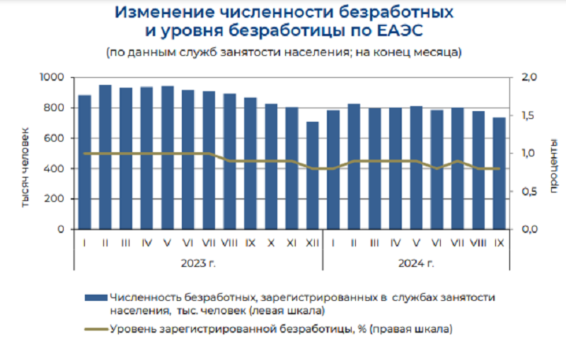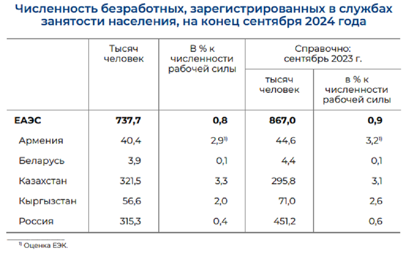 Численность безработных, зарегистрированных в службах занятости населения, в государствах – членах ЕАЭС на конец сентября 2024 года составила 737,7 тысячи человек, или 0,8% численности рабочей силы, передаёт BaigeNews.kz со ссылкой на сообщение Евразийской экономической комиссии.