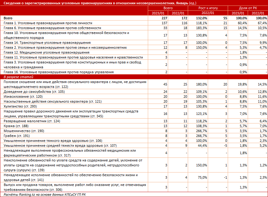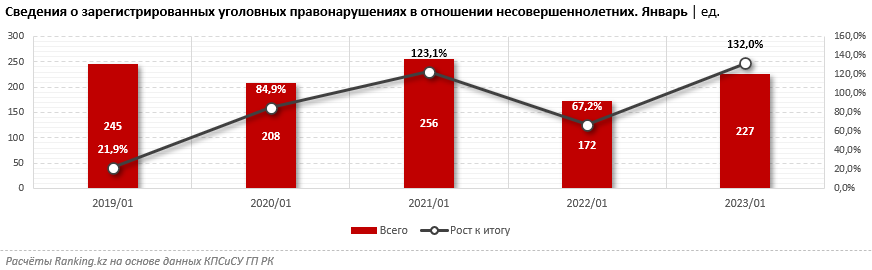 В январе текущего года в стране зарегистрировали 227 уголовных правонарушений в отношении несовершеннолетних - сразу на 32 процента больше, чем в январе прошлого года, передаёт BaigeNews.kz со ссылкой на Ranking.kz.