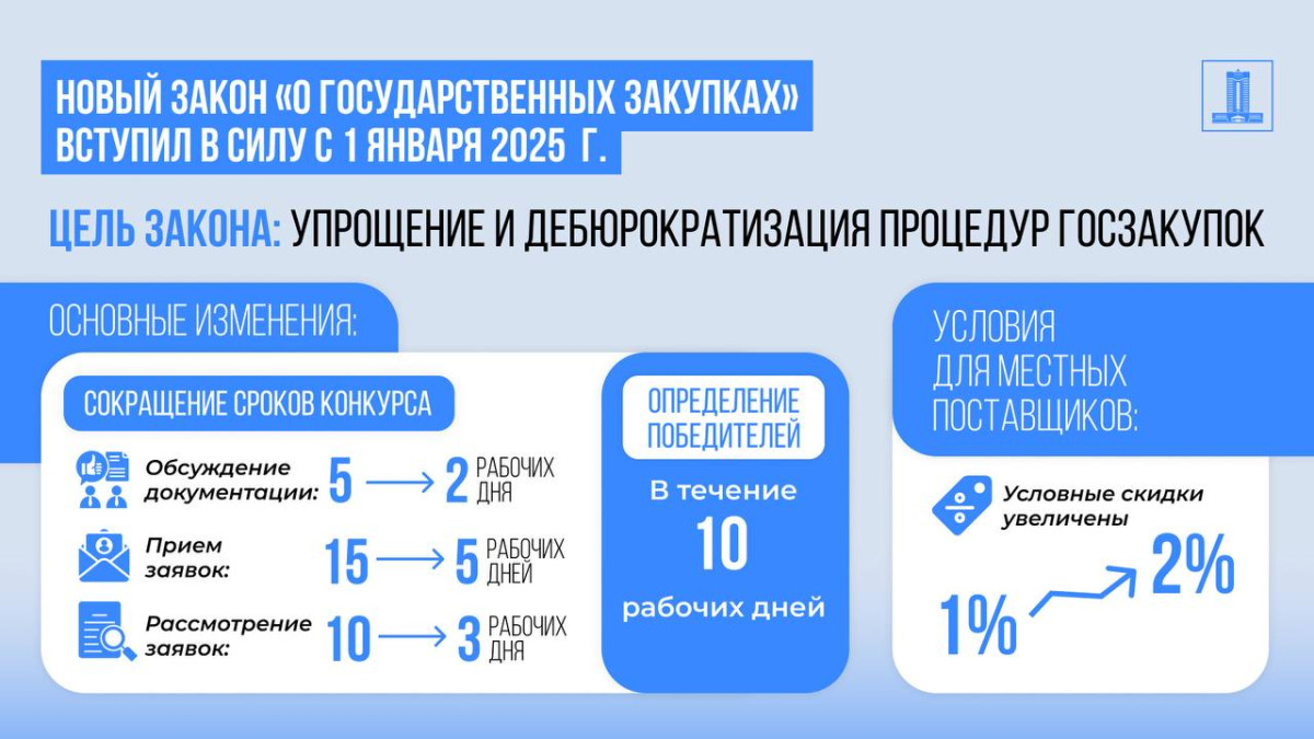 1 июля 2024 года Глава государства подписал новый Закон "О государственных закупках", нацеленный на упрощение и дебюрократизацию процедур. В рамках Закона приняты новые Правила, включающие в себя максимальное сокращение сроков проведения госзакупок.