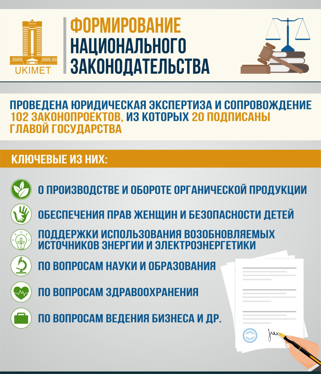 Министерство юстиции РК активно участвовало в формировании национального законодательства, проведя юридическую экспертизу и сопровождение 102 законопроектов, из которых 20 были подписаны главой государства.