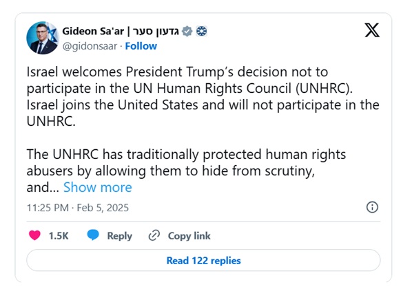Израиль вслед за США объявил, что прекратит участвовать в работе Совета ООН по правам человека (СПЧ ООН). Об этом в своем аккаунте в соцсети Х в среду, 5 февраля, написал министр иностранных дел страны Гидеон Саар. "Израиль приветствует решение президента Трампа не участвовать в работе Совета ООН по правам человека. Израиль присоединяется к Соединенным Штатам и не будет участвовать в работе СПЧ ООН", - говорится в опубликованном министром сообщении.